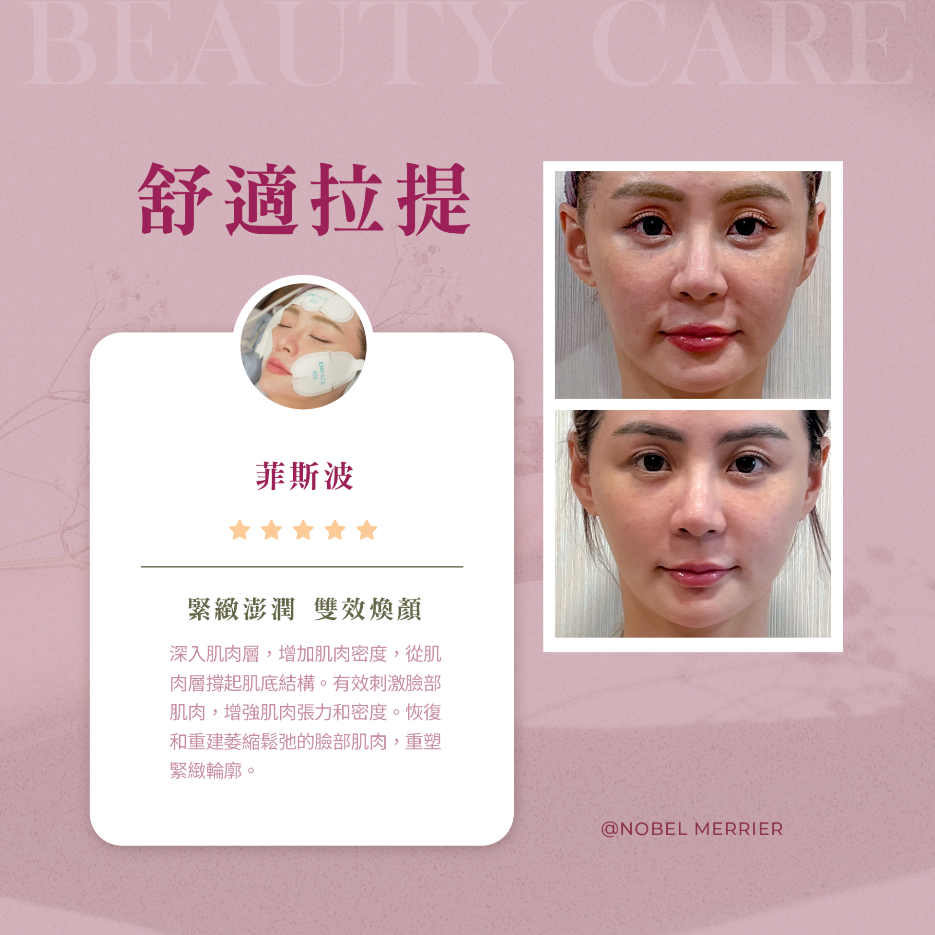 「以前總擔心臉部鬆弛,做完4次 EMFACE 後,真的感覺底層肌肉被『練』起來了!線條變得很緊實,重點是完全不痛、沒有修復期,拍片前去保養也超放心!」