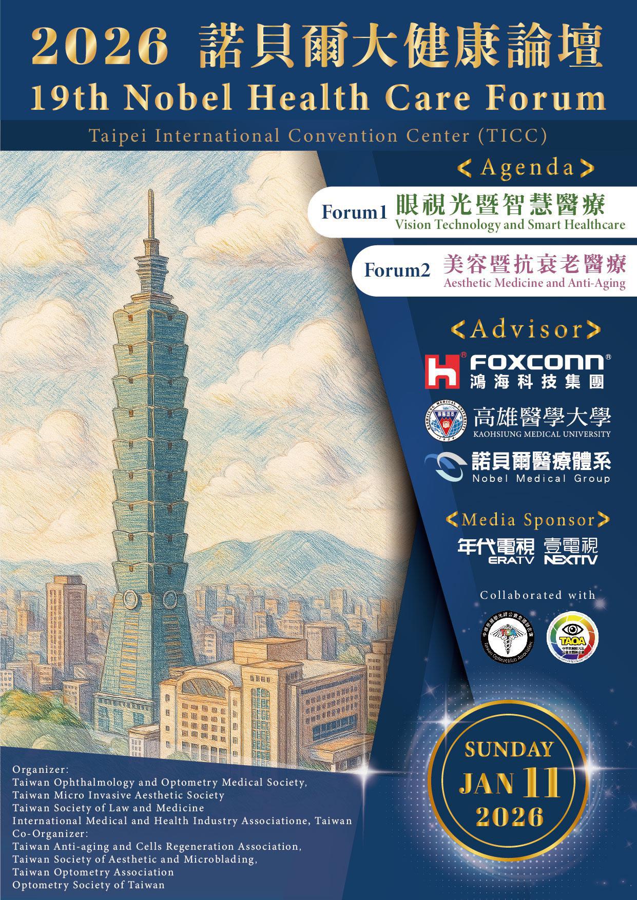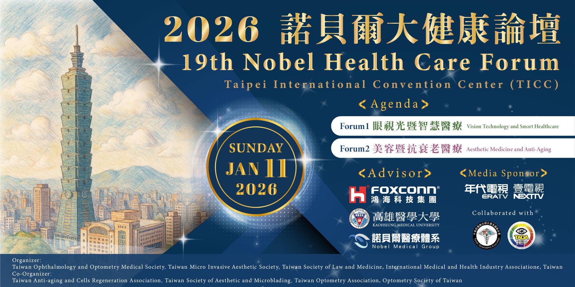 由諾貝爾醫療體系、鴻海科技集團及高雄醫學大學指導,並由台灣眼視光醫學會、台灣醫事法律學會、台灣微整形美容醫學會、台灣國際醫療暨健康產業協會共同聯名主辦的「2026諾貝爾大健康論壇」,即將於2026年1月11日(日)在台北國際會議中心(TICC)盛大登場。內容豐富且具國際視野,論壇將以「眼視光暨智慧醫療」與「美容暨抗衰老醫療」雙主題揭開序幕,匯聚來自兩岸與國際的醫學專家,共同分享全球最新醫療科技、臨床應用趨勢與智慧醫療法規發展框架,預期將吸引逾1200位醫師及相關產業人士參與。