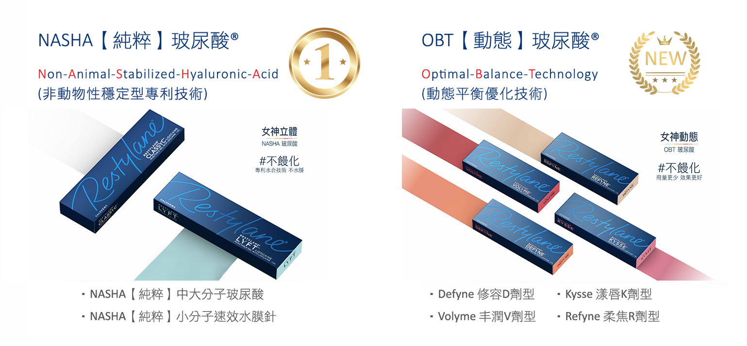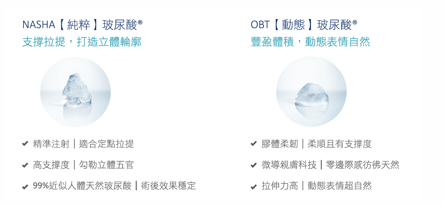 除了原本的顆粒型NASHA玻尿酸,後期也推出了凝膠型的OBT動態玻尿酸。